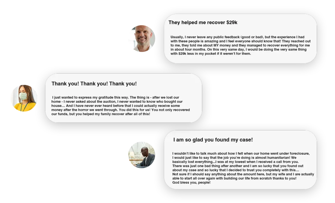 We believe that each and every citizen has the right to know this and that is why we want to join our forces and help you recover your funds after the foreclosure.